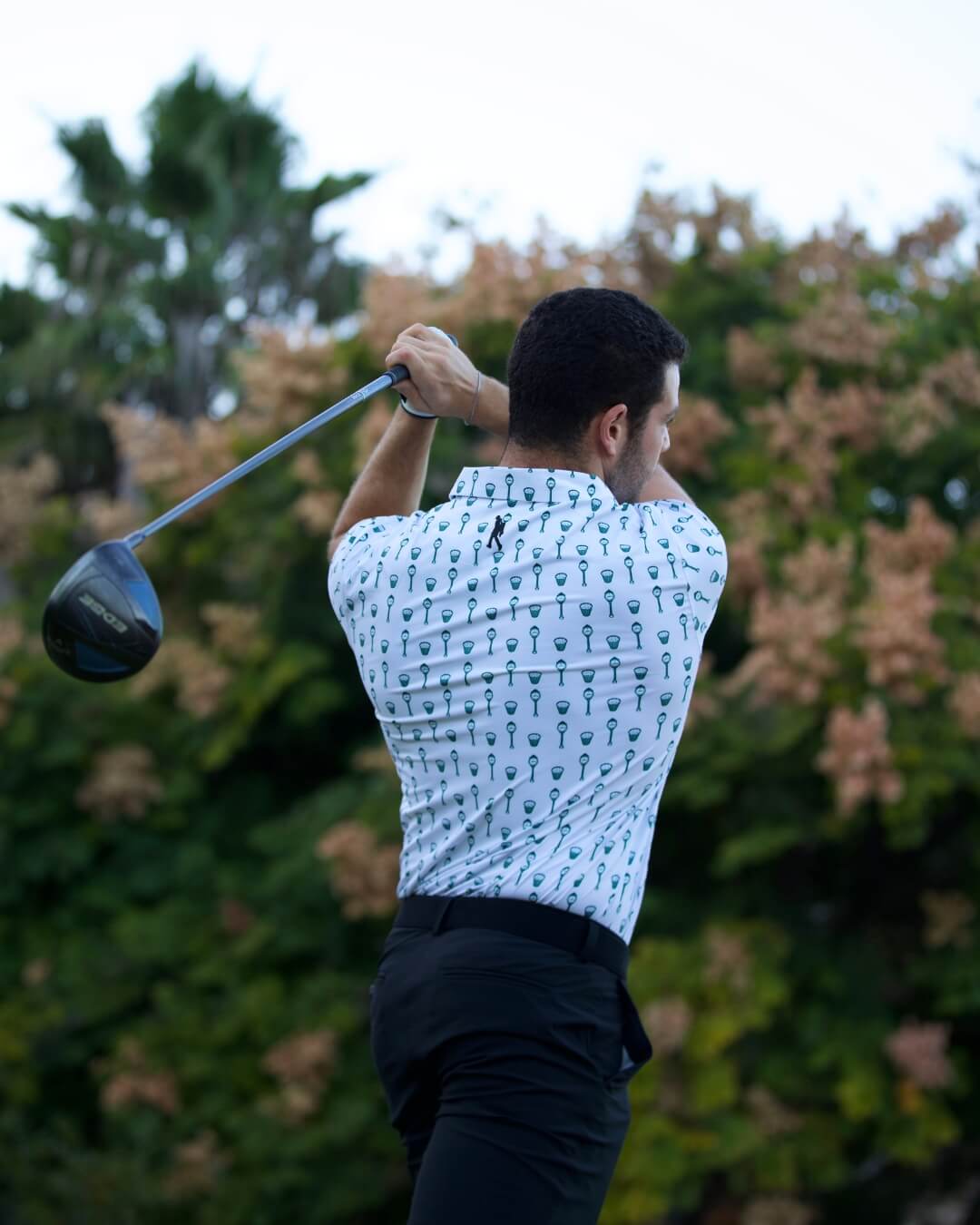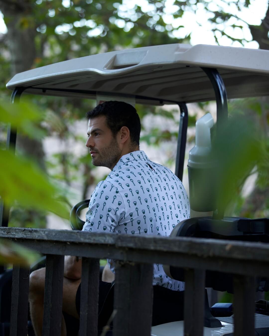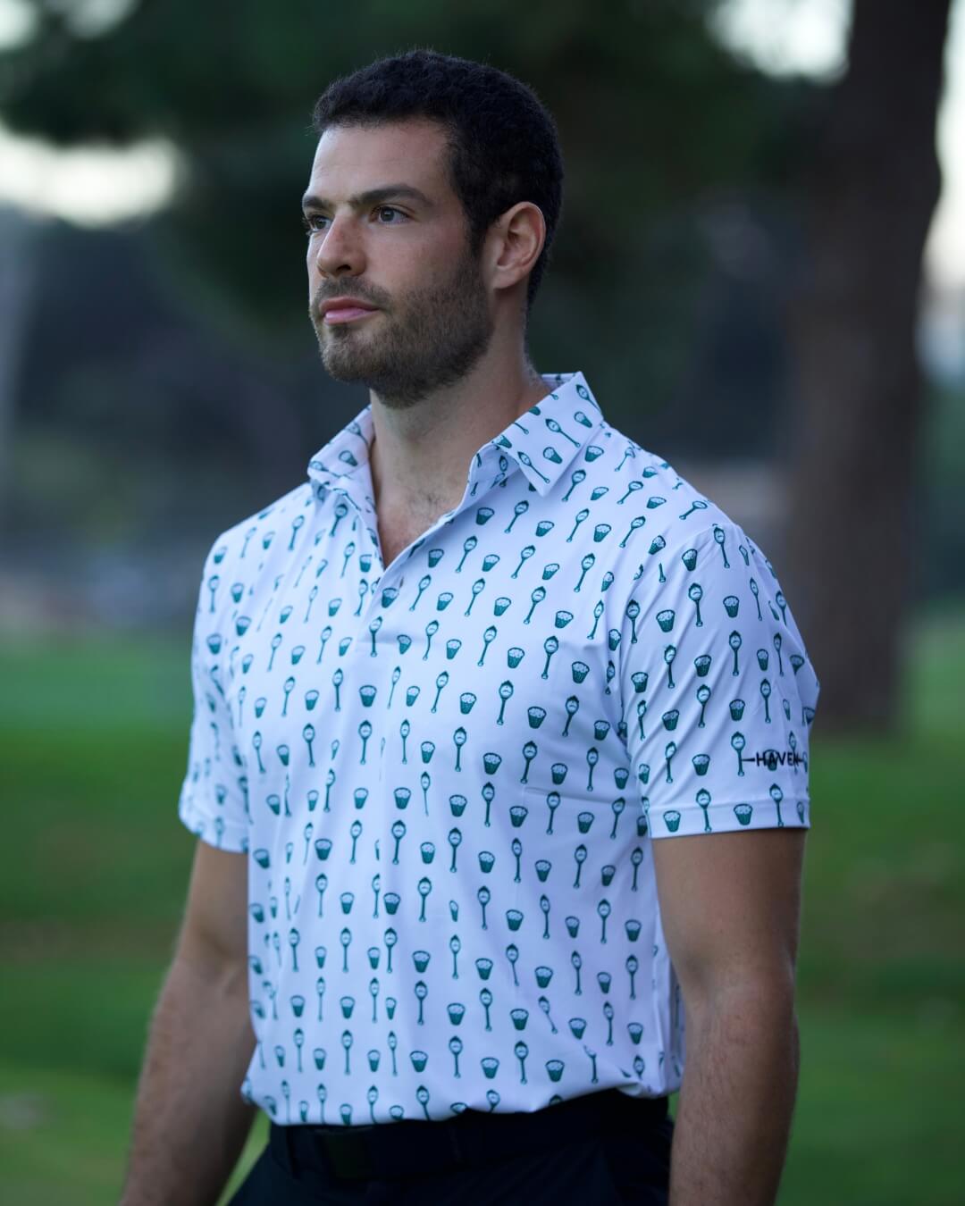 - White polo with country club themed print.