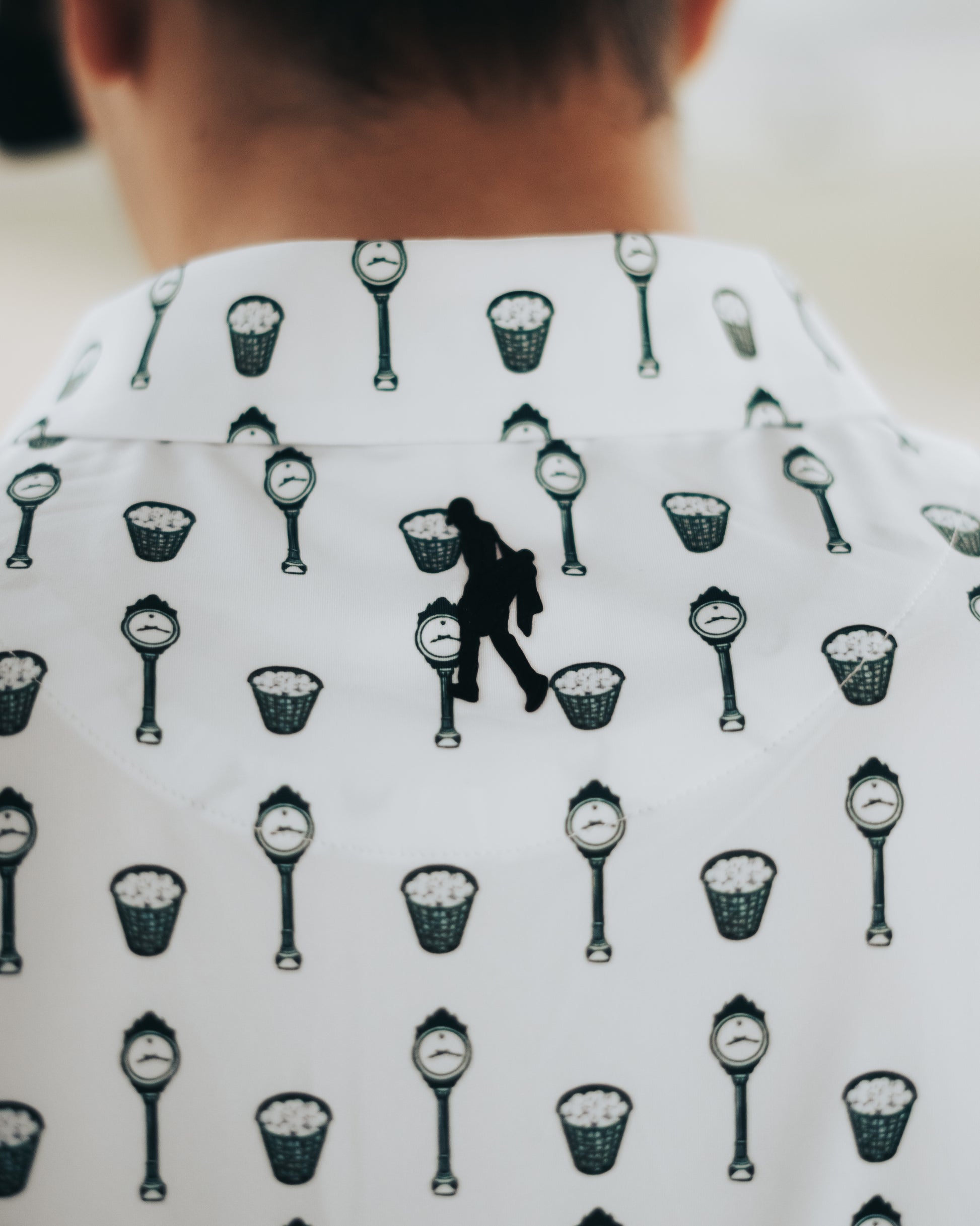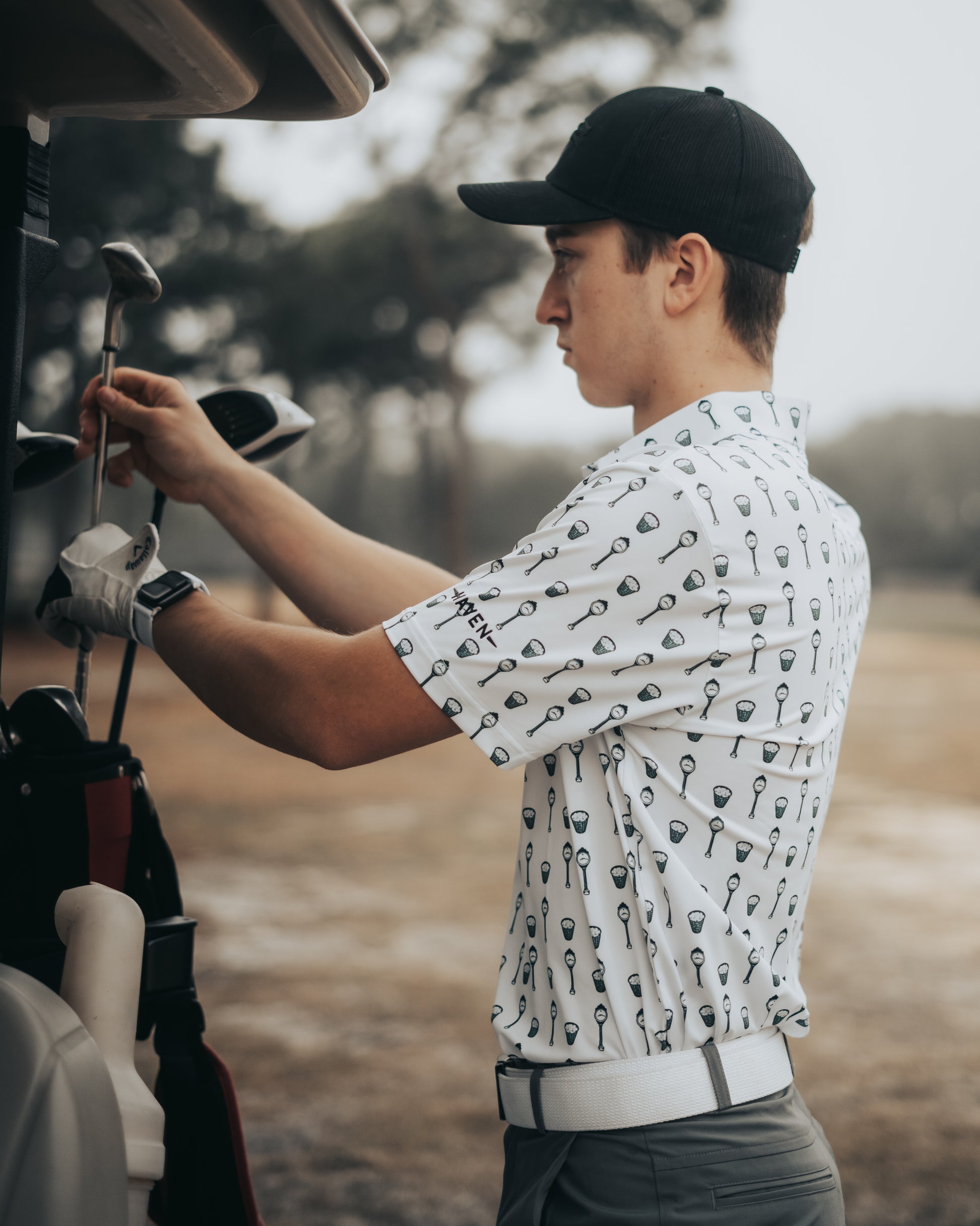 - White polo with country club themed print.