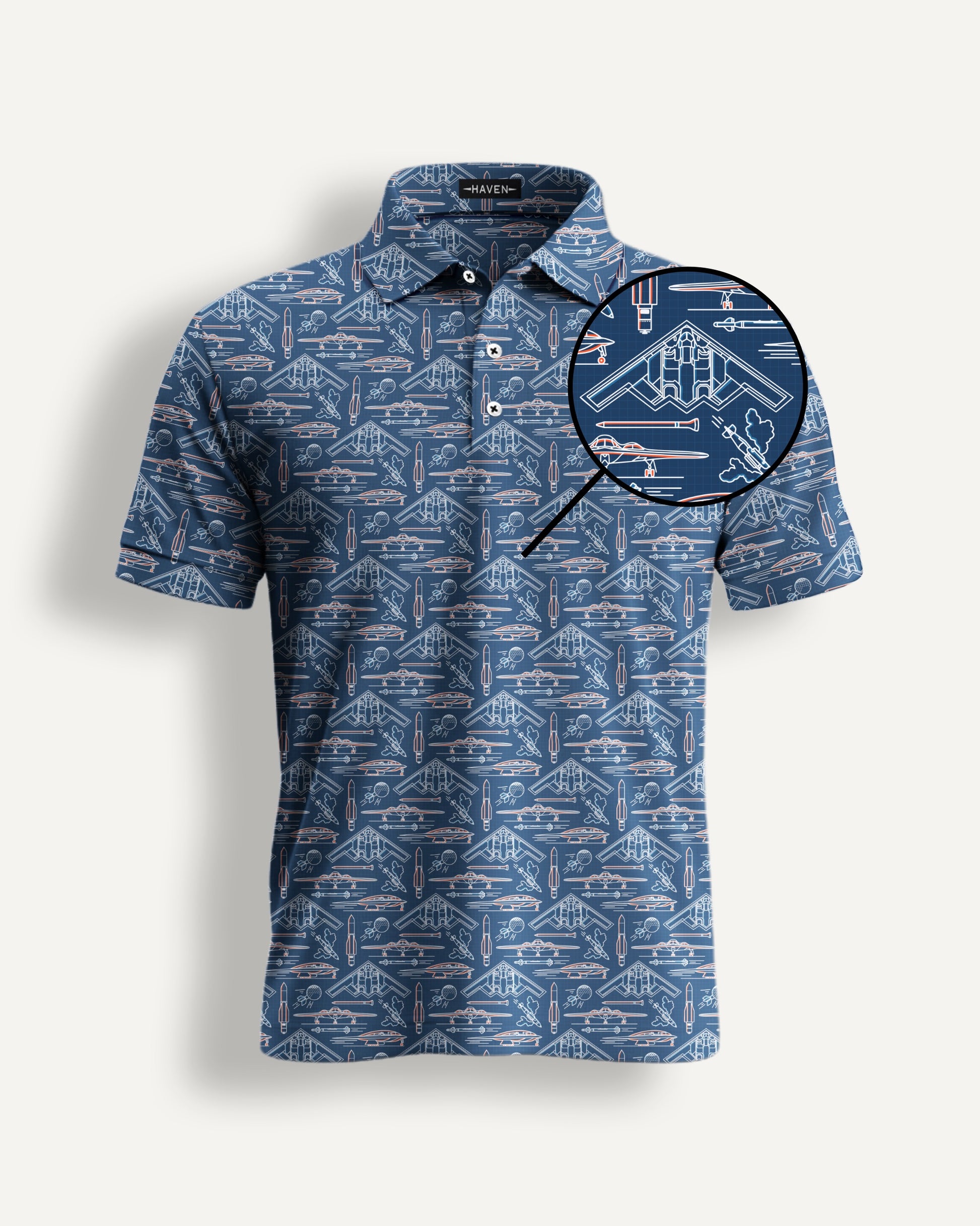 Stealth meets style. Inspired by the legendary B-2 Bomber, The Ghost is built for those who move quiet but play loud. A deep navy blue base accented with subtle red and white detailing gives this polo a commanding presence without ever needing to shout.